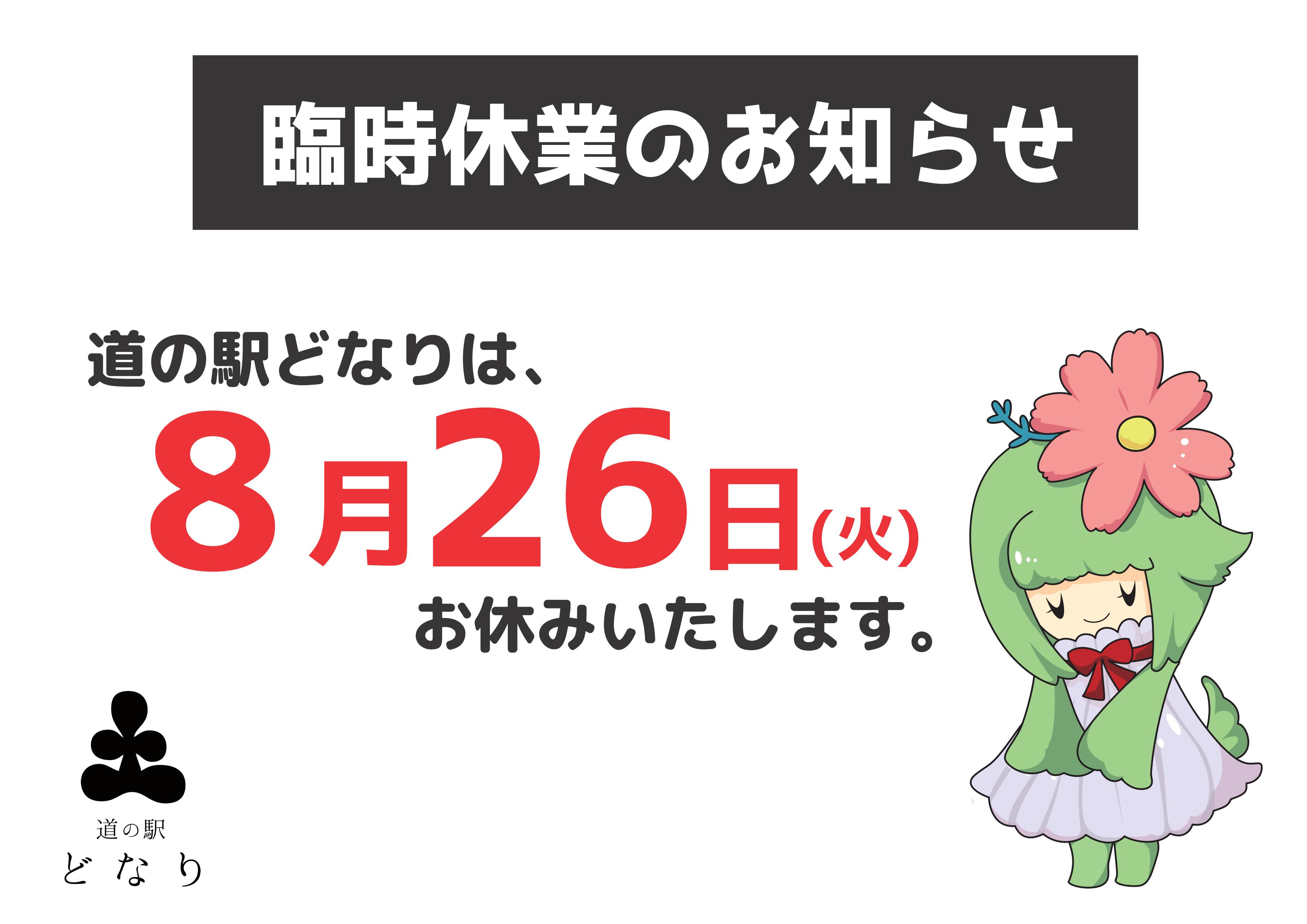 道の駅どなりは、9月4日(火)を臨時休業とさせていただきます。